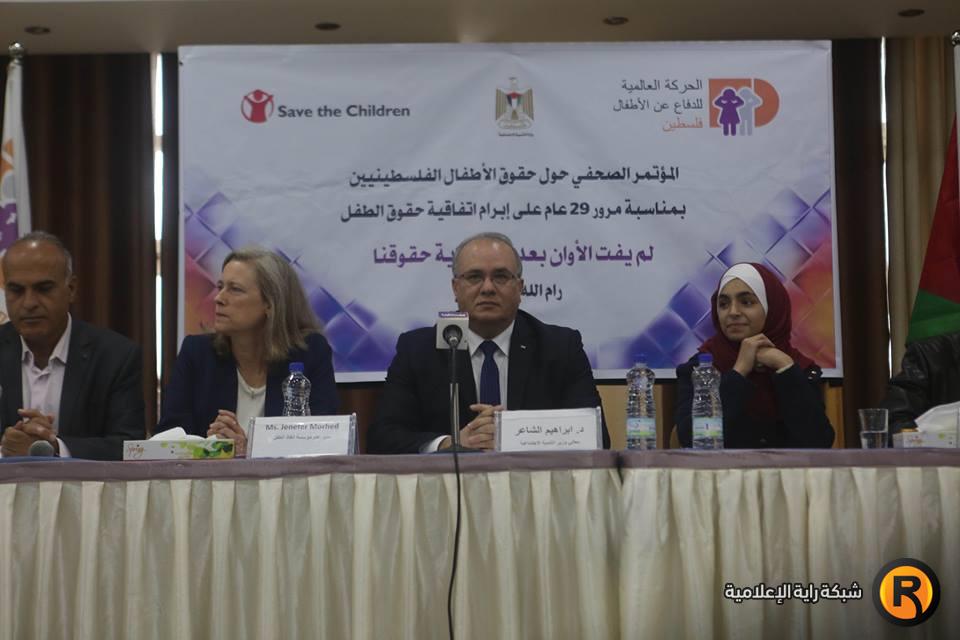 فعاليات المؤتمر الصحفي الخاص بمرور 29 عاما على ابرام اتفاقية الطفل والذي تشارك فيه الوزارة ممثلة بالوزير د. ابراهيم الشاعر، وبتنظيم من الحركة العالمية للدفاع عن الاطفال ومشاركة مجلس اطفال فلسطين.