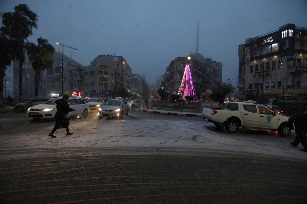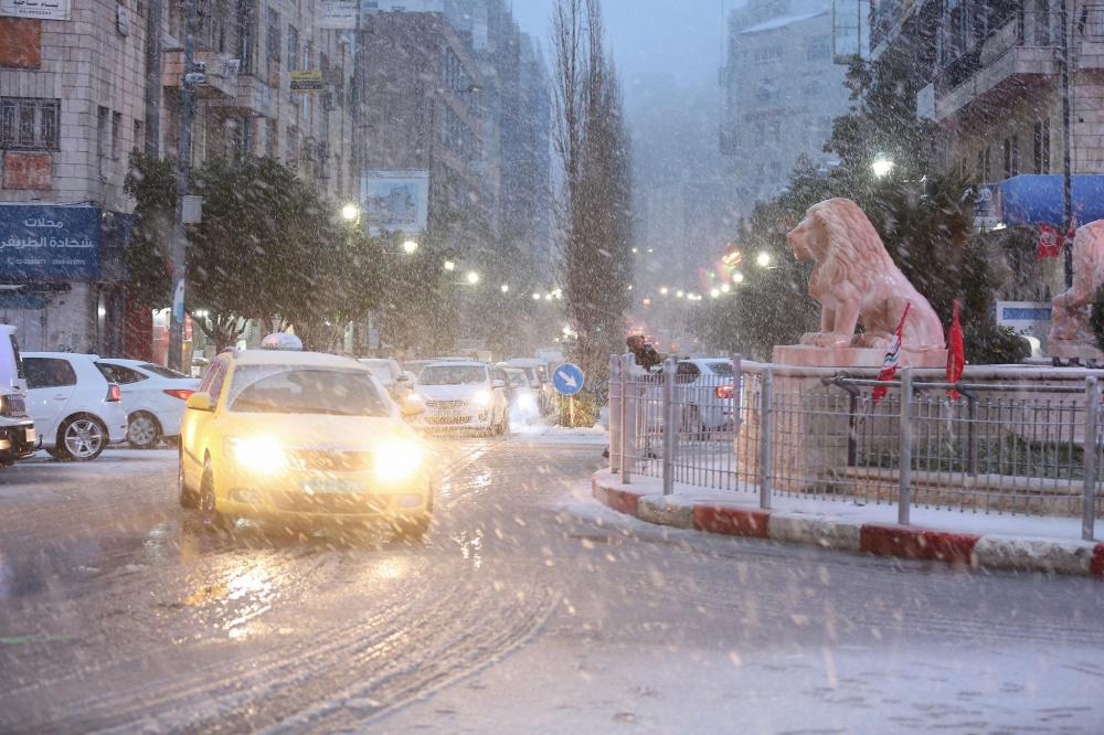 مدينة رام الله تستقبل الثلوج لأول مرة منذ 6 سنوات خلال المنخفض الجوي القطبي العميق الذي يضرب فلسطين منذ يوم الثلاثاء الماضي.