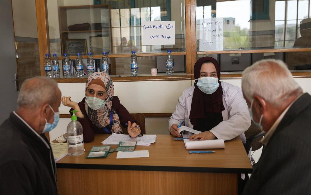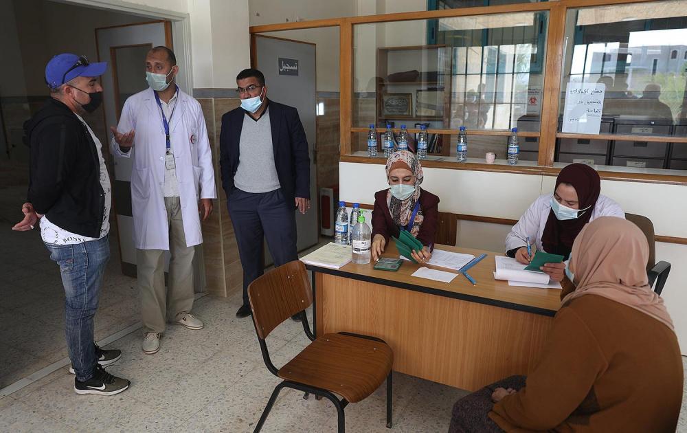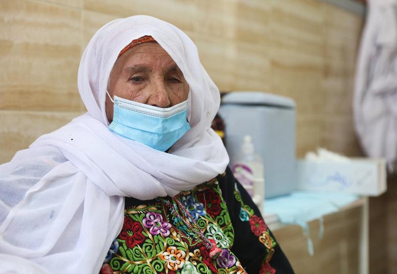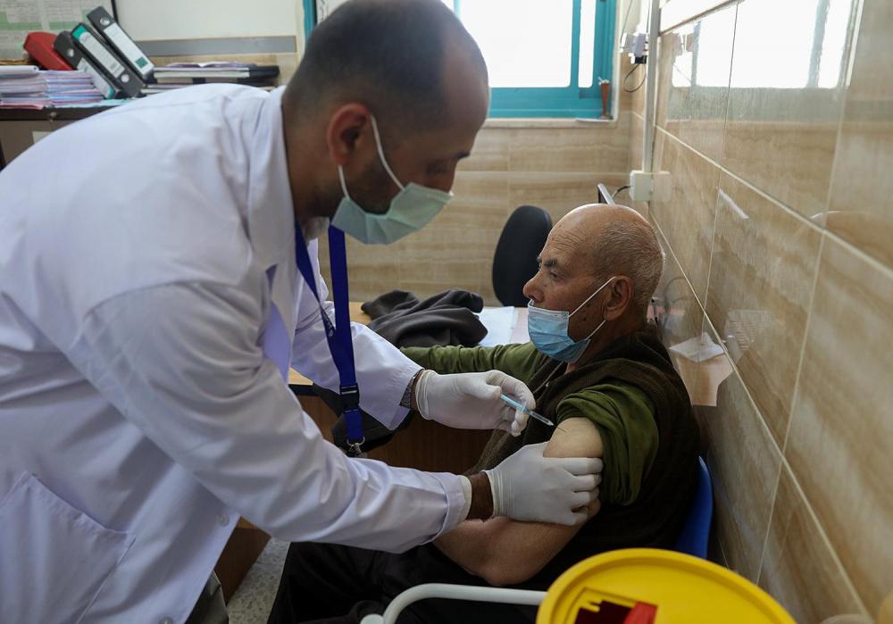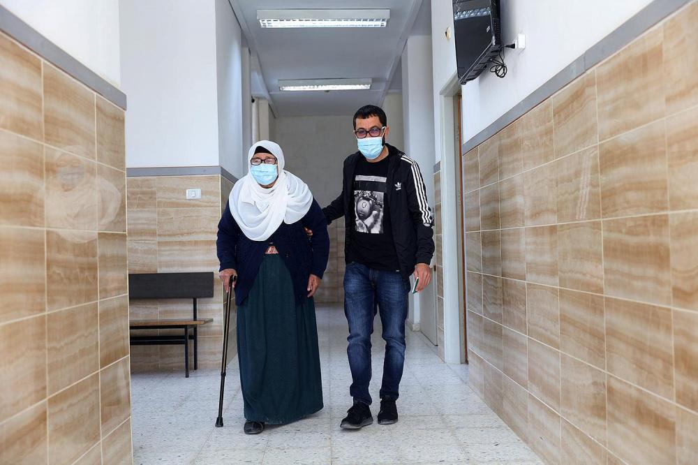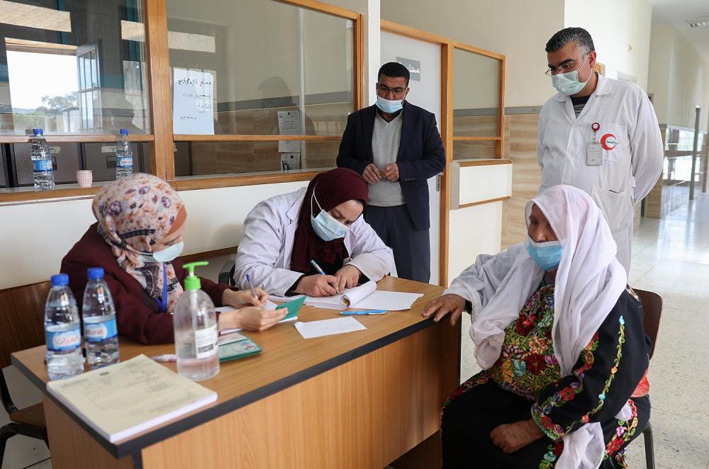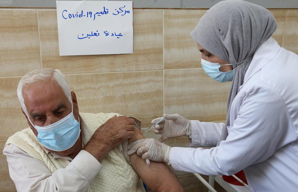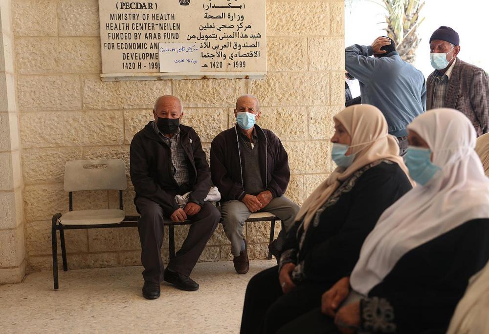 كبار السن يتلقون الجرعة الأولى من اللقاح الصيني "سينوفارم" في مركز التطعيم ببلدة نعلين بمحافظة رام الله والبيرة، والذي افتتحته الصحة للتخفيف عن مراكز التطعيم داخل المحافظة.