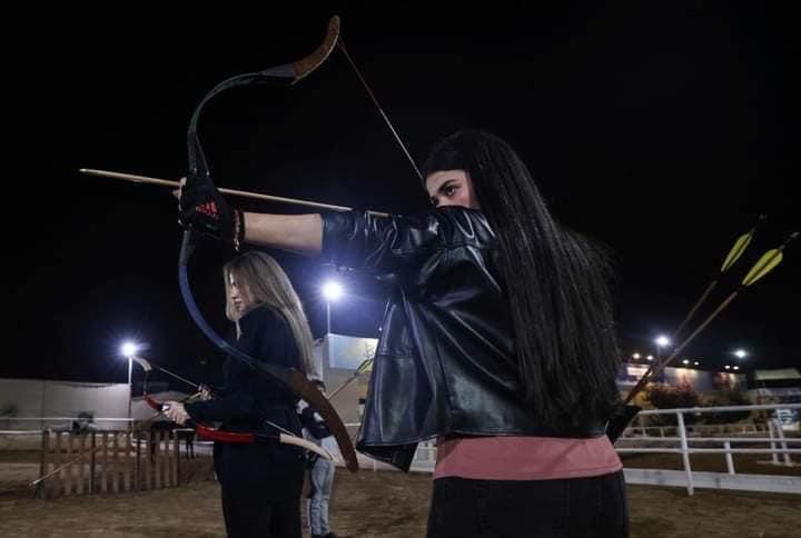 شبان وفتيات يتدربون على رمي السهام المصنوعة يدويًا داخل نادي الأصدقاء للفروسية بغزة.