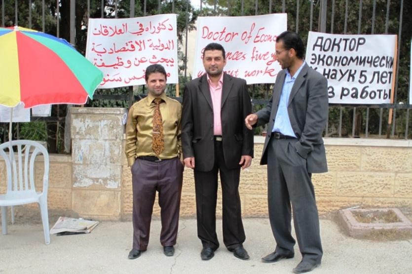 اعتصام ل 3 من حملة شهادة الدكتوارة امام مجلس الوزراء في رام الله اليوم حيث لم يجدوا وظيفة واضطر احدهم للعمل في البناء لتوفير لقمة العيش !