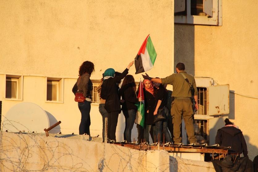 متظاهرون يعتلون احد المباني التابعة للارتباط العسكري الاسرائيلي ويرفعون الأعلام الفلسطينية