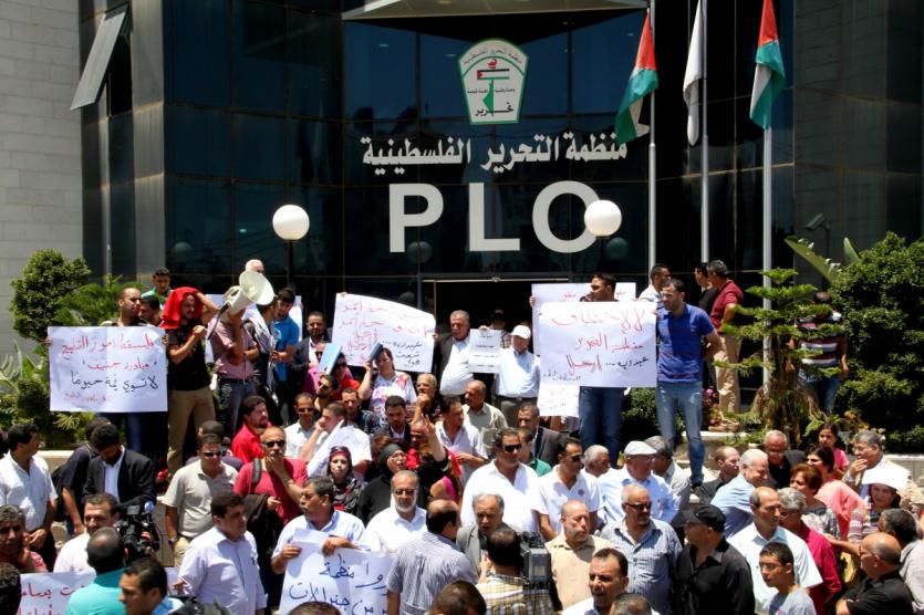 معتصمون يطالبون بإقالة ياسر عبد ربه امام منظمة التحرير الفلسطينية في مدينة رام الله