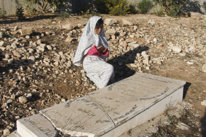 مسلمون يزورون مقابر أقاربهم في أول يوم لعيد الأضحى في مخيم الجلزون