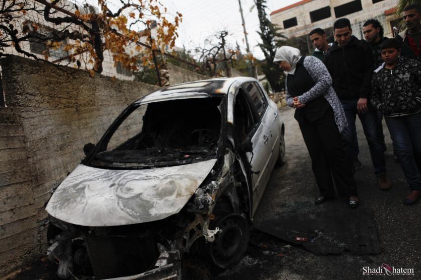 مستوطنون يحرقون مركبات ويخطون شعارات عنصرية قرب مخيم الجلزون شرق رام الله