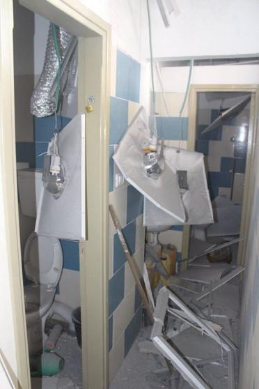 جانب من الدمار الذي لحق بمبنى الدوحة التجاري التابع لبلدية رفح، نتيجة الاستهداف المباشر من الطائرات الحربية بدون طيار.