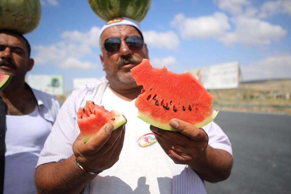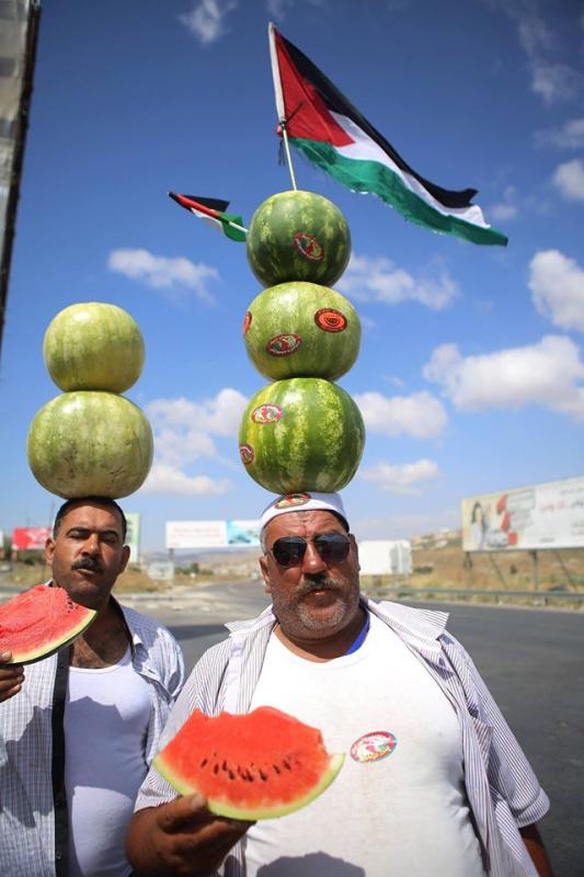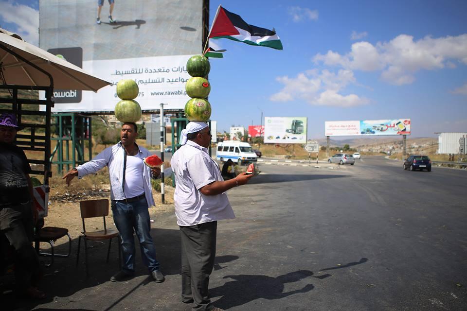 بائع البطيخ أبو حلوم من مخيم بلاطة يوازن البطيخ على رأسه في محاولة لجذب الزبائن في الطريق بين نابلس ورام الله.