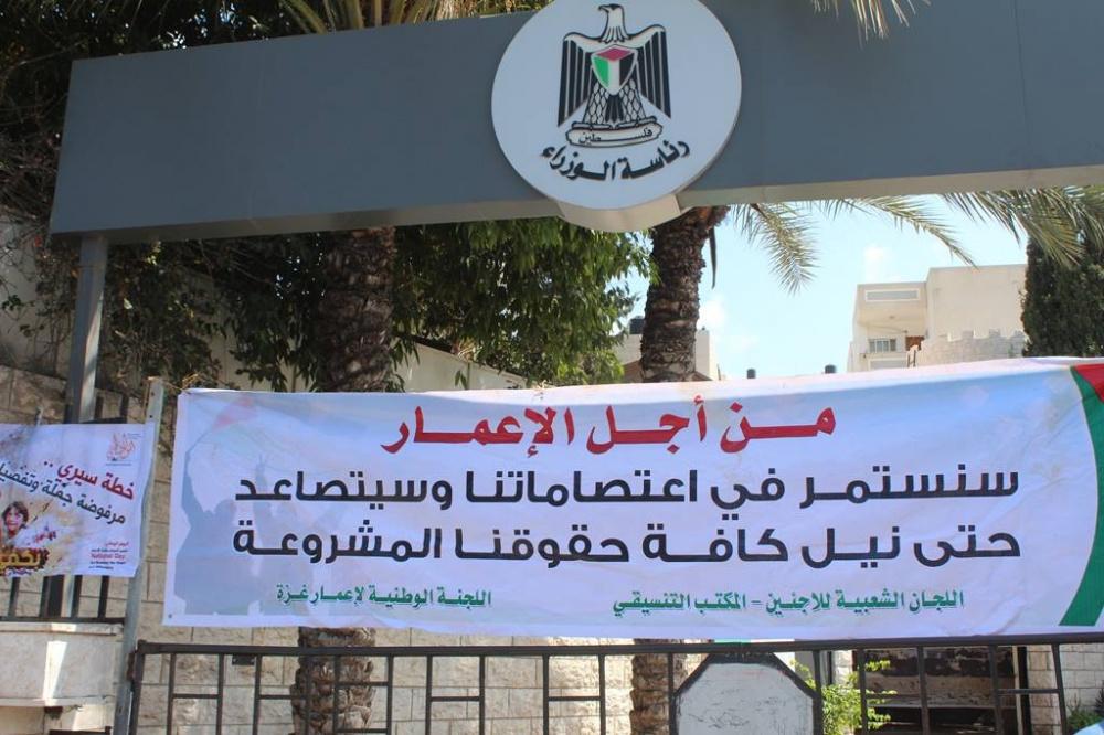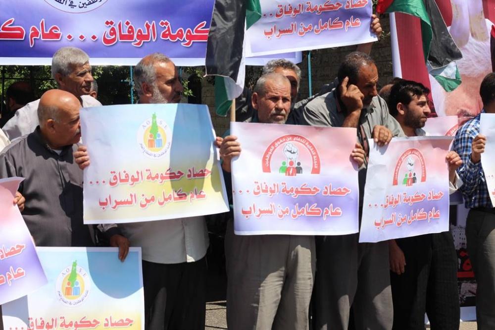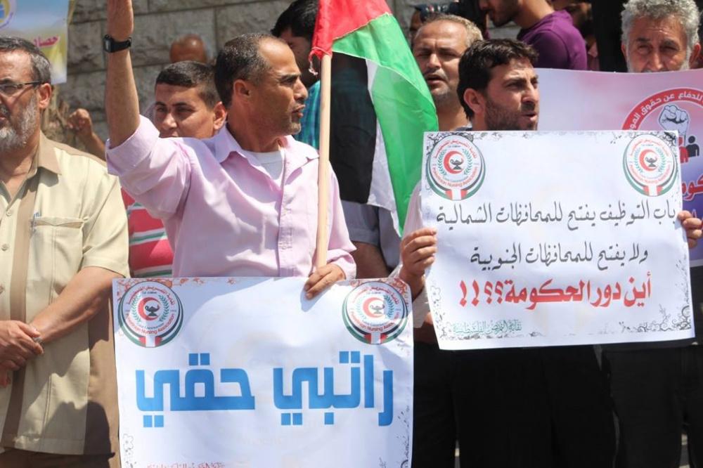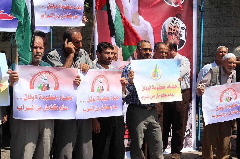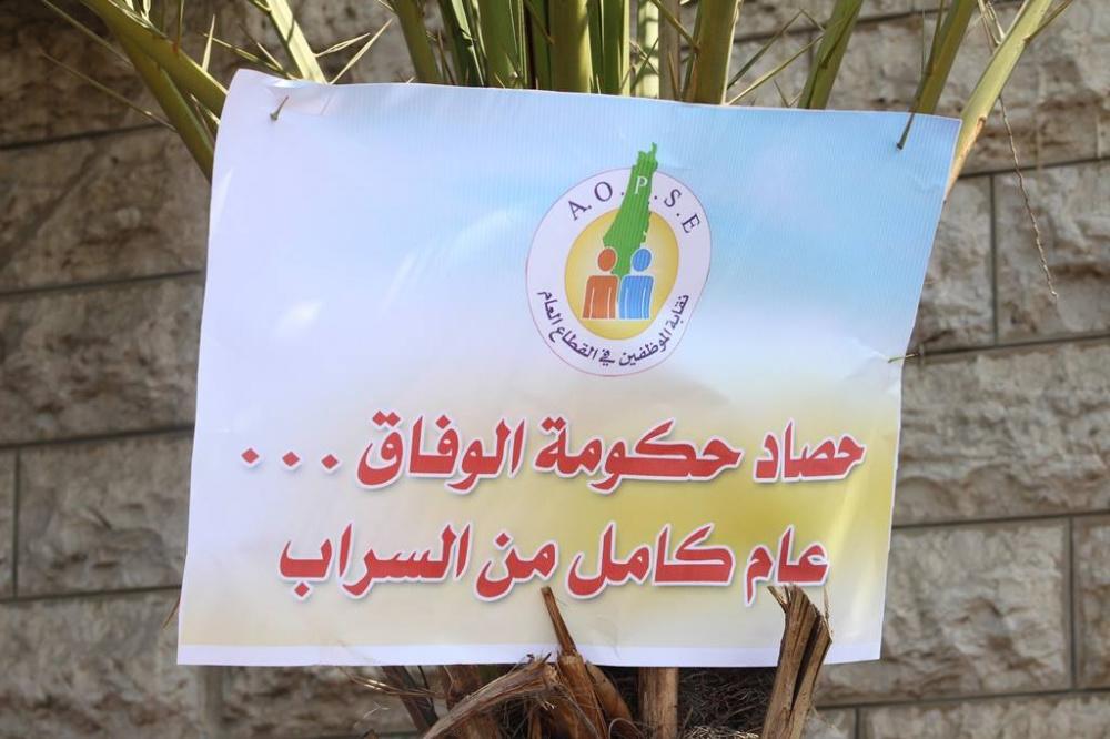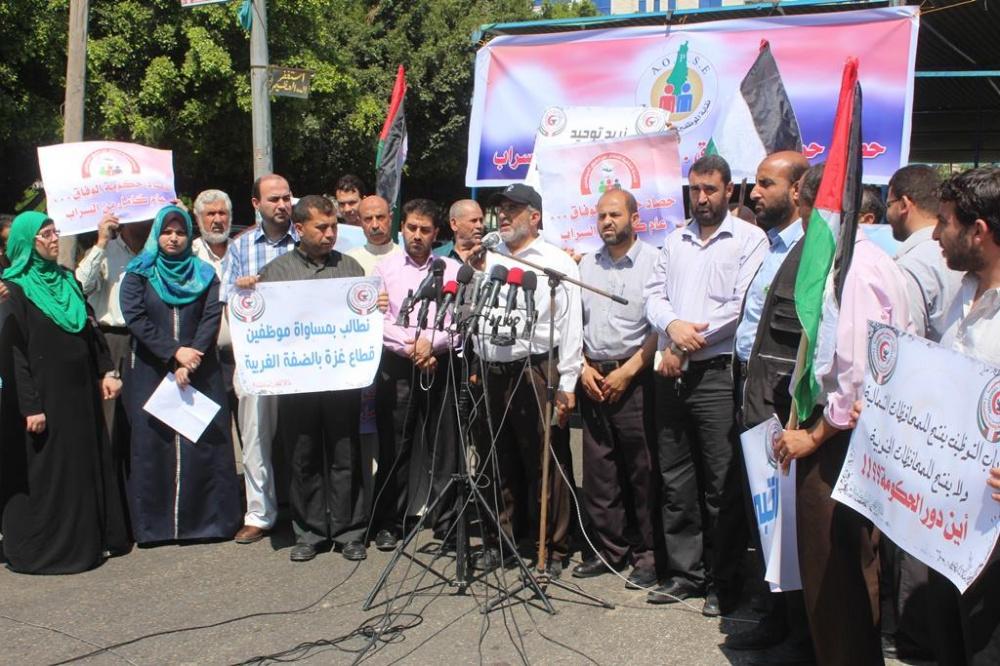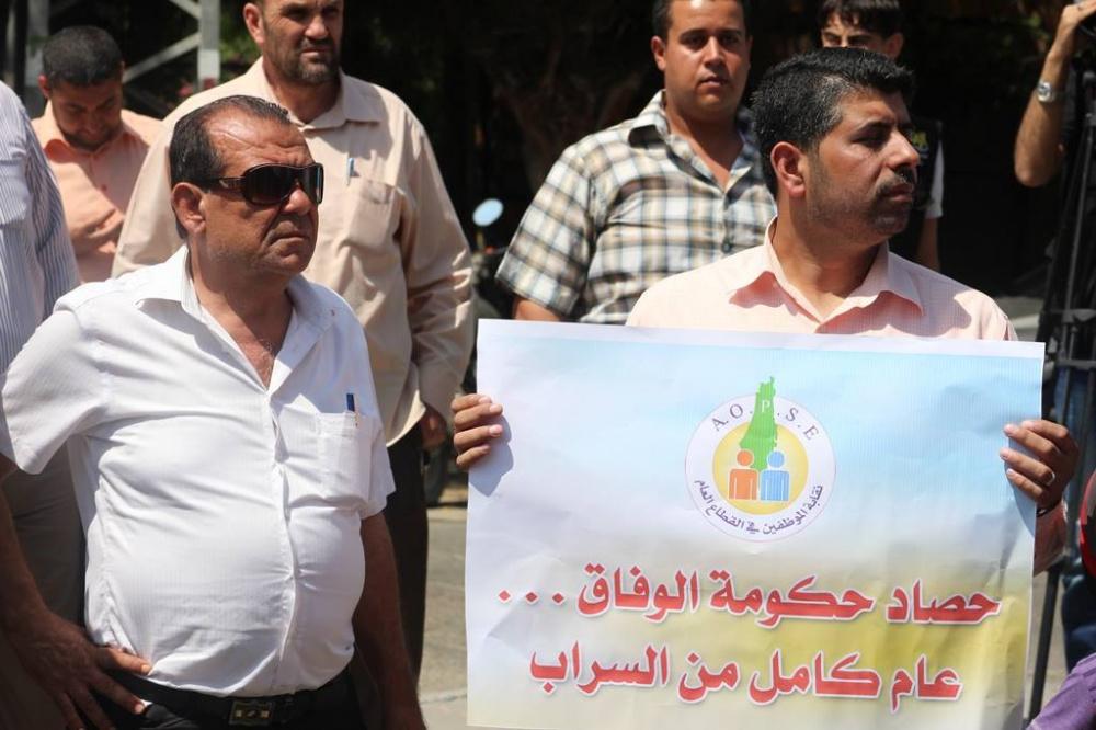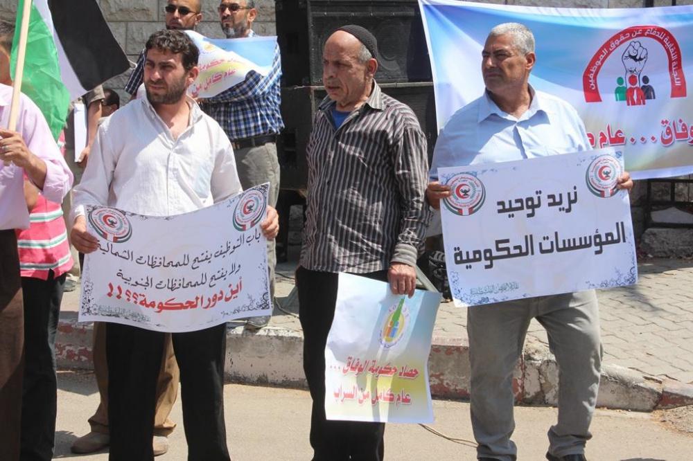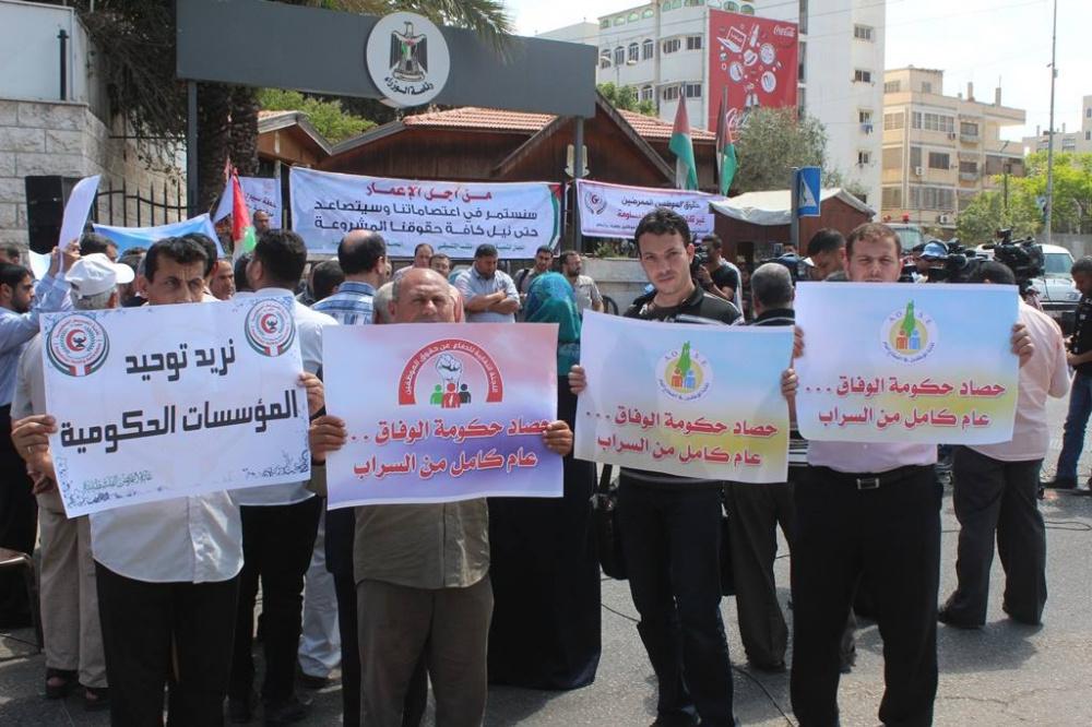 اعتصم موظفو حكومة غزة السابقة اليوم الثلاثاء، أمام مقر مجلس الوزراء غرب مدينة غزة احتجاجا على عدم صرف حكومة الوفاق رواتبهم المتأخرة وللمطالبة بحقوقهم، حيث يأتي هذا الاعتصام بعد مرور عام كامل على تشكيل حكومة الوفاق الوطني برئاسة د. رامي الحمد الله.