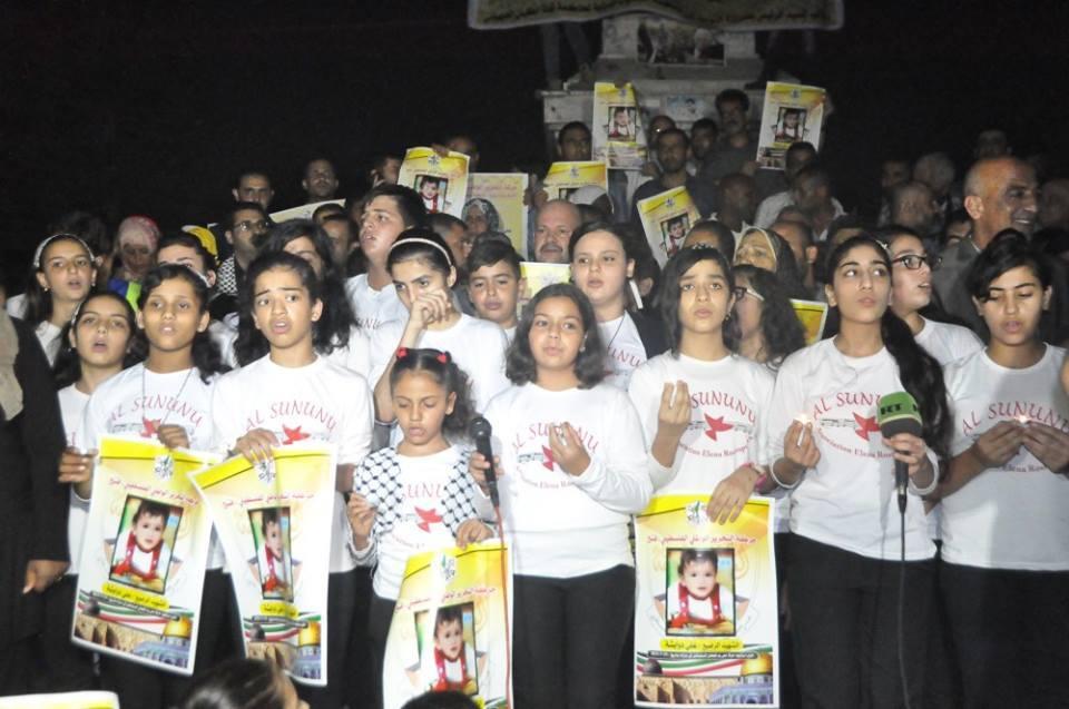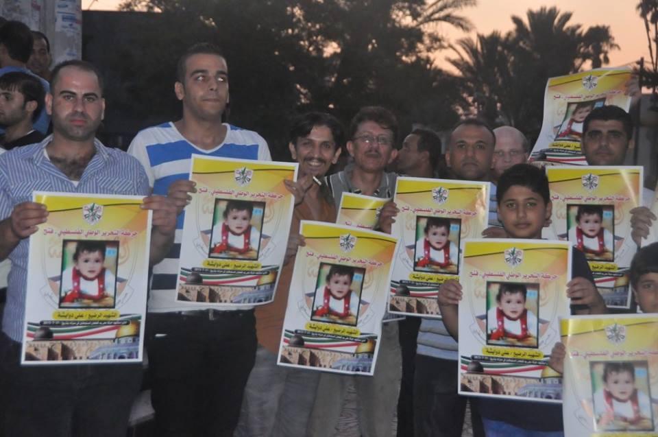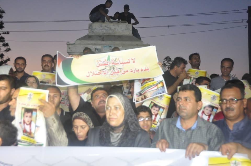 نظمت حركة فتح وقفة احتجاجية مساء السبت على الجريمة البشعة التي طالت الطفل على دوابشة وعائلة دوابشة باكملها حيث تم احراق بيت عائلة الدوابشة من قبل قطعان المستوطنين وادى بذلك الى استشهاد الطفل البريء على دوابشة واصابة عائلته بجروح بالغة الخطورة.