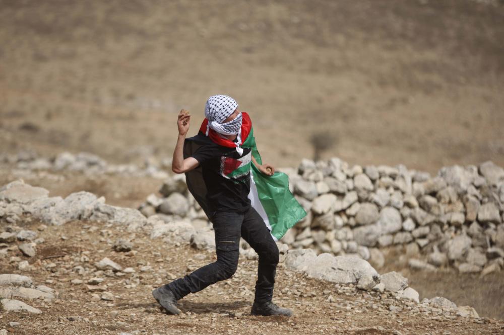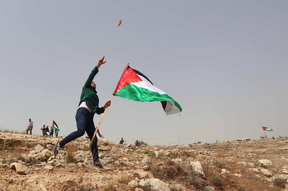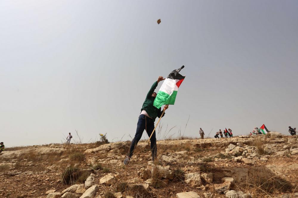 فلسطينيون يرفعون العلم الفلسطيني خلال تظاهرة ضد الاستيطان في قرية النبي صالح
