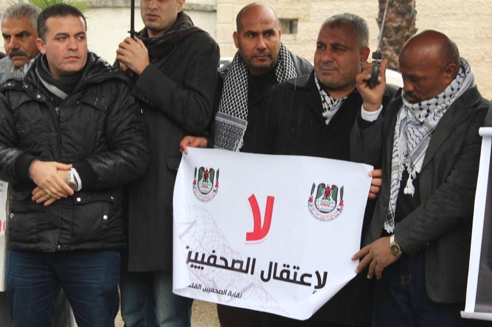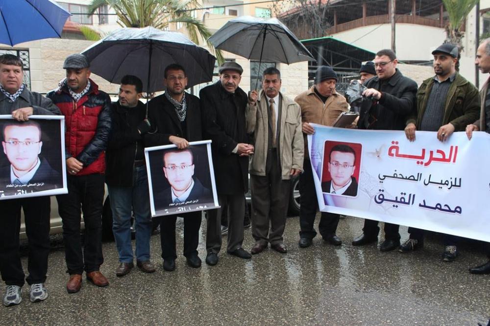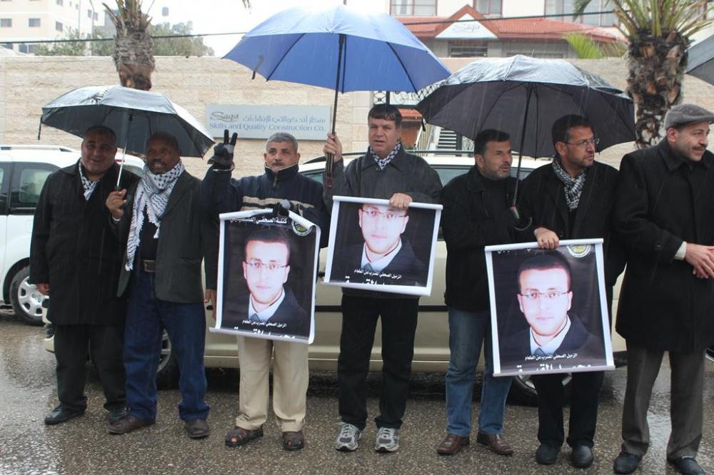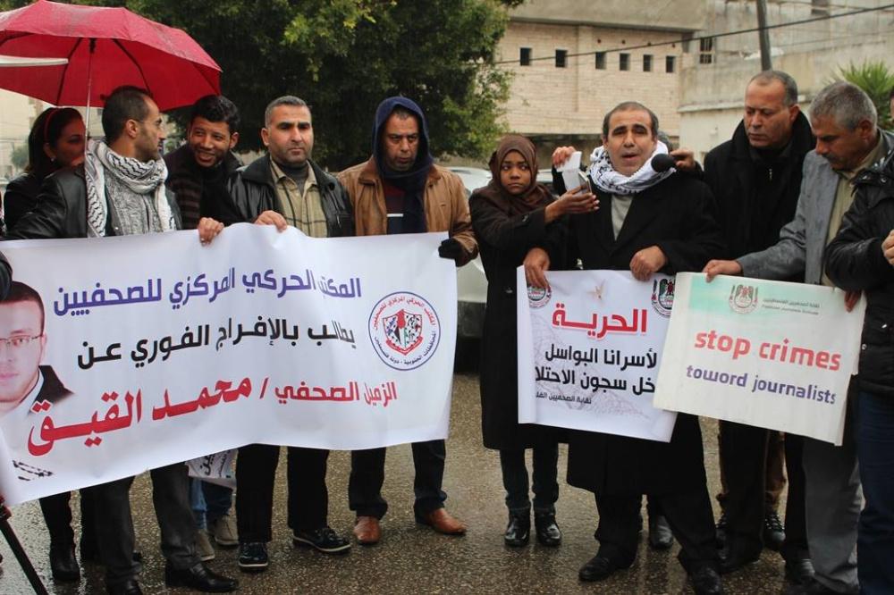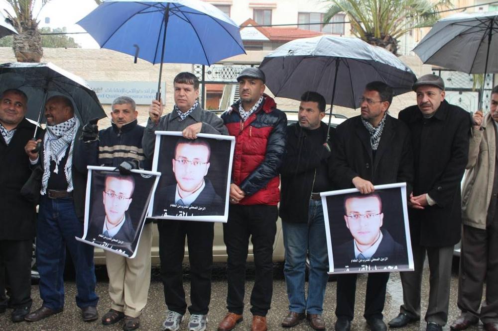 نظمت نقابة الصحفيين في قطاع غزة اليوم الاربعاء، اعتصام تضامني امام مقر المندوب السامي للمطالبة بالافراج عن الأسير الصحفي محمد القيق المضرب عن الطعام في سجون الاحتلال منذ 64 يوما.