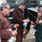 أطلقت جمعية واعد للأسرى والمحررين بغزة مساء اليوم الأربعاء، حملة توزيع "طعام الحرية مي وملح" لتوعية المواطنين والتضامن مع الأسير المضرب عن الطعام محمد القيق، سبقها وقفة تضامنية بحضور أسرى محررين، حيث ارتدى المشاركون ملابس الأسرى في سجون الاحتلال وقاموا بتوزيع الماء والملح على المواطنين.