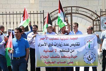 اعتصام أمام مبنى الصليب الأحمر في نابلس احتجاجاً على قرار تقليص الزيارات لعائلات الأسرى مرة بالشهر