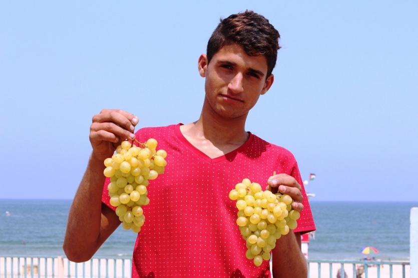 الشاب جمال شملخ (18 عاما)، انتهز فرصة نضوج فاكهة العنب مبكرا، ليجد له مكانا مناسبا على شاطئ البحر، وعينه على غزارة الانتاج وتدني الاسعار ليحقق ربحا موسميا يساعده على تغطية مصروفاته السنوية.