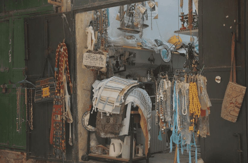 كوفية وعقال، مسبحة وطاقية، فخاريات وأدوات تراثية مختلفة تعكس هوية الخليل خاصة وفلسطين عامة؛ محتويات المحل الخاصة بالحاج اسحاق قفيشة، منظمة في صورة وضعت لتستقبل السياح، غير أن صاحبهاّ "يَكُشُ الذباب" على مدار ساعات نهاره لأن البلدة القديمة شحيحة الزوار والحركة التجارية.