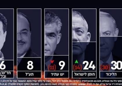 الليكود 30، حصانة لإسرائيل 24، يوجد مستقبل 9، العربية للتغيير 8، العمل 6، اليمين الجديد 6، يهدوت هتوراة 6، القائمة المشتركة 6، شاس 5، كلنا 4، إسرائيل بيتنا 4، جسر 4، ميرتس 4، البيت اليهودي 4.