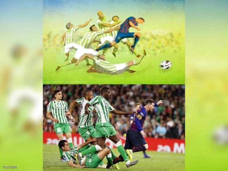 وفي الرسمة، كان ميسي يميل برأسه إلى الأمام بينما يحاول لاعب من الفريق الخصم الإمساك به.