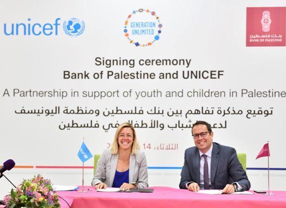 وقع بنك فلسطين ومنظمة الأمم المتحدة للطفولة والأمومة والشباب "اليونيسف" مذكرة تفاهم من أجل التعاون المشترك لدعم الشباب والأطفال في فلسطين. وجرى توقيع مذكرة التفاهم في مقر المركز الرئيسي للإدارة العامة لبنك فلسطين في مدينة رام الله بحضور السيد هاشم الشوا، رئيس مجلس إدارة مجموعة بنك فلسطين، والسيدة جينيفيف بوتن الممثل الخاص لليونيسف في دولة فلسطين، والمدراء العامون في ومدراء الإدارات ورؤساء الدوائر في مجموعة بنك فلسطين، وحشد من الصحفيين والإعلاميين.