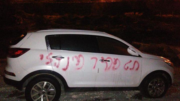 اعطب مستوطنون، فجر اليوم الخميس، اطارات مركبتين وخطوا شعارات عنصرية في قرية عينابوس جنوب نابلس.