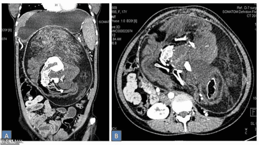 وعندما فحص الأطباء بطنها، شعروا بوجود كتلة كانت صلبة إلى حد ما، ولكن ليس باستمرار، ولذلك بدت كأنها ورم كبير وغريب، كما ذكرت صحيفة "دايلي ميل" البريطانية.