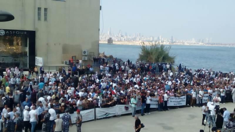 ورفع المعتصمون الأعلام الفلسطينية واللافتات المطالبة بتسهيل الهجرة وسط انتشار كثيف للقوى الأمنية.
