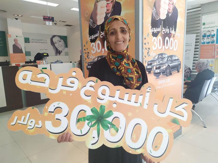 فازت المواطنة تفاحة محمد عيسى خضر، المدخرة لدى بنك القاهرة عمان -فرع (الارسال) في رام الله، بجائزة الأسبوع الثاني والعشرين ضمن حملة البنك، على حسابات التوفير "كل أسبوع فرحة"، وقيمتها 30,000 دولار.