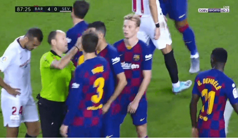 وطرد ديمبيلي خلال المباراة التي انتصر بها برشلونة على إشبيلية 4-0 ضمن الأسبوع الثامن من مسابقة الدوري الإسباني، كما أنّه سجّل الهدف الثالث لفريقه.