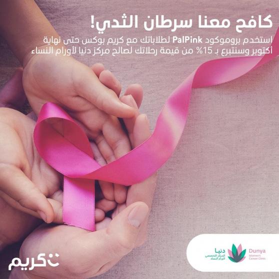 دعماً لجهود التوعية بضرورة الكشف المبكر عن سرطان الثدي، أعلنت شركة "كريم" عن مشاركتها في شهر التوعية العالمي بسرطان الثدي، حيث أطلقت "كريم" الرمز الخاص (PalPink) لمستخدمي تطبيق "كريم بوكس" في رام الله، بحيث يتم إدخال الرمز الخاص بالحملة عند طلب توصيل مستلزمات الأفراد والمؤسسات عبر "تطبيق كريم بوكس"، وتقوم "كريم" بالتبرع بنسبة 15% من تكلفة كل رحلة لصالح مركز دنيا التخصصي لأورام النساء في رام الله. كما سيقوم كباتن "كريم بوكس" بتوزيع منشورات توعوية حول أهمية الفحص والكشف المبكر عن سرطان الثدي خلال رحلاتهم طيلة الشهر الجاري.