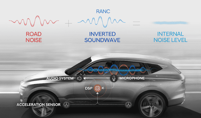 إلاّ أن مجموعة هيونداي موتور تمكّنت بفضل تقنية التحكم النشط بضوضاء الطريق، الجديدة والأولى من نوعها على الإطلاق في عالم صناعة السيارات، من تحسين مستوى الهدوء داخل المقصورة بشكل كبير. إذ يمكن للنظام الجديد تحليل مختلف أنواع الضوضاء لحظة بلحظة وإنتاج الموجات الصوتية المعكوسة الكفيلة بإخمادها. وثمّة أنواع مختلفة من ضوضاء الطريق التي يمكن للتقنية الجديدة معالجتها، مثل صوت العجلات على الطريق.