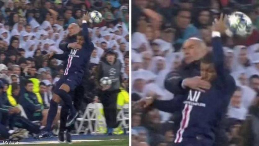 وبالعودة لفيديو اللقطة، يظهر زيدان قريبا من خط التماس، وهو يحاول إمساك كرة عالية كانت في طريقها لخارج الملعب، بينما يقفز مبابي للحاق بالكرة، ليمسك زيدان بمبابي بطريقة غريبة، وكأنه يمنعه من الوصول للكرة.