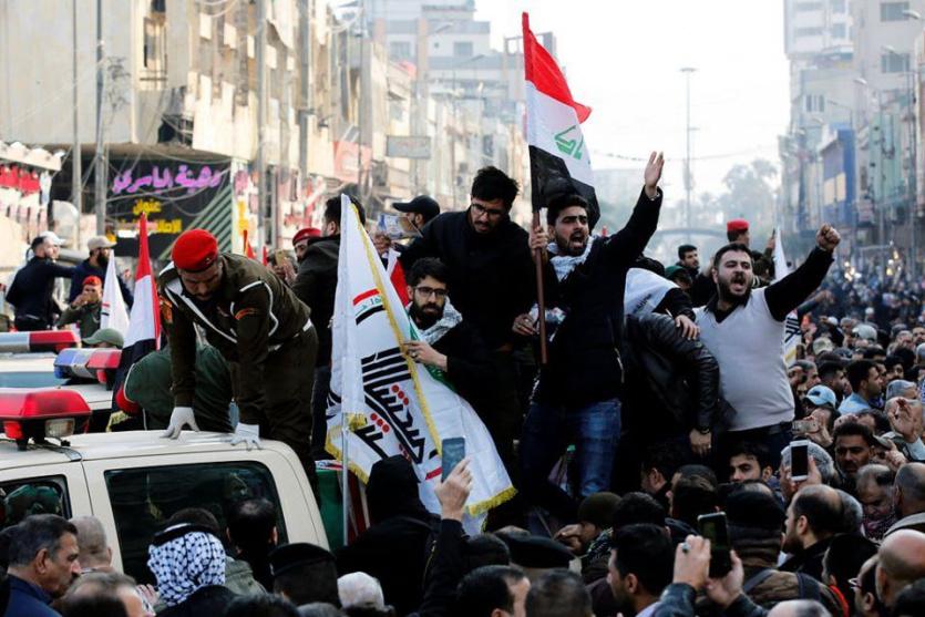 شارك آلاف العراقيين وهم يهتفون "الموت لأميركا"، اليوم السبت، في بغداد في تشييع رئيس فيلق القدس في الحرس الثوري الإيراني قاسم سليماني ونائب رئيس هيئة الحشد الشعبي العراقي أبو مهدي المهندس اللذين قتلا الجمعة في ضربة أميركية.