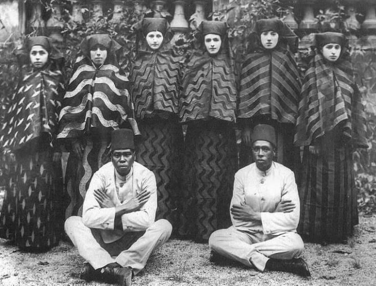 صورة التقطت عام 1909 لحريم السلطان العثماني عبد الحميد الثاني مع اثنين من الخصيان السود، وهم رجال تم تعطيل قدرتهم الجنسيه بشكل متعمد بهدف العمل داخل قصور السلاطين والتجار ورجال الدوله، وكان لدى السلطان عبد الحميد 200 رجل من الخصيان يقومون على خدمة نسائه.