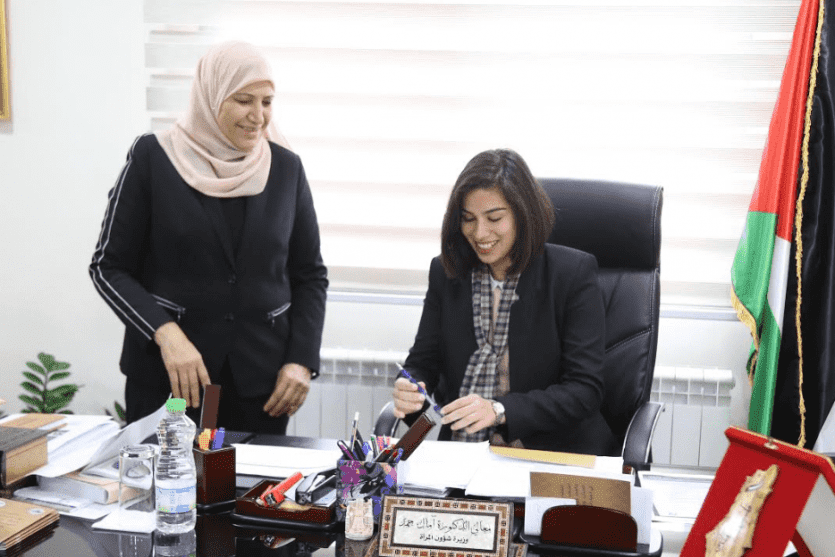 تولت اليوم الشابة الطالبة في جامعة فلسطين التقنية خضوري سوار عواد وزيرة شؤون المرأة الشاب لمدة يوم واحد، وذلك ضمن فعاليات برنامج تميز في موسمه الخامس، وذلك بحضور رئيسة مجلس إدارة منتدى شارك الشبابي رتيبة ابو غوش، بالشراكة مع صندوق الأمم المتحدة للسكان.