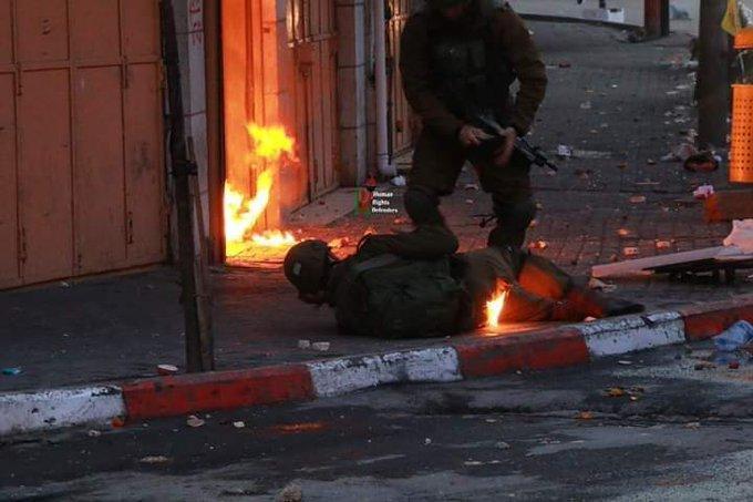 اظهر شريط فيديو إصابة جندي إسرائيلي بزجاجات حارقة خلال المواجهات التي اندلعت في منطقة باب الزاوية بمدينة الخليل.