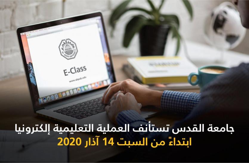 أعلنت جامعة القدس عن استئناف العملية التعليمية عبر نظام التعلم الإلكتروني عن بعد، ابتداءً من السبت القادم 14 آذار، من خلال نظام e-Class وما يشمله من تطبيقات مثل Zoom و BBB. جاء هذا القرار ذلك في إطار خطة متكاملة وطارئة طورتها الجامعة على إثر التعطيل الناجم عن أزمة فيروس كورونا، واعتمدها مجلس الجامعة الذي عقد عن بُعد عبر النظام ذاته.