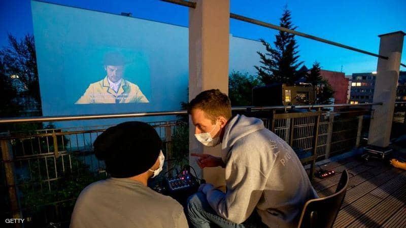 وتمثل الحل الذي تم التوصل إليه، ومن دون التعرض لاحتمال الإصابة بمرض كوفيد-19، في عرض أفلام على جدران باحات المباني.