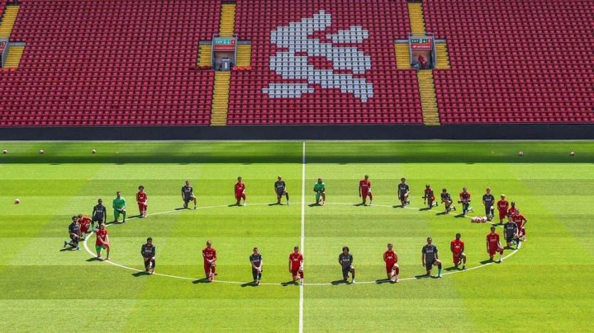 جلس لاعبو نادي ليفربول الإنجليزي لكرة القدم في وسط الملعب وجثوا على ركبهم، في ملعب "أنفيلد"، كخطوة احتجاج على مقتل المواطن الأميركي، جورج فلويد على يد شرطي أميركي أبيض.