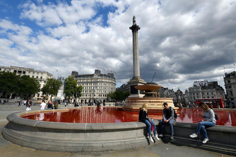 احتجاجا على تربية الحيوانات..محتجون يصبغون مياه نافورتين في لندن باللون الأحمر