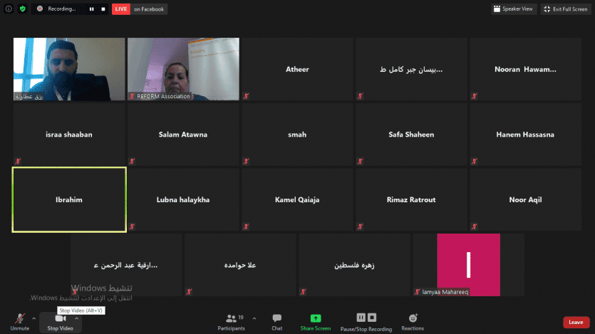 نفذت المؤسسة الفلسطينية للتمكين والتنمية المحلية REFORM— لقاء توعويا بعنوان "المساواة والعدالة"، وذلك عبر تقنية الرابط الالكتروني ZOOM بحضور ومشاركة مستفيدي مشروع دور المرأة في تعزيز السلم الاهليفي محافظة الخليل وعدد من الفاعلين\ات مجتمعيا، واستضافة الاستاذ أبراهيم البرغوثي الرئيس التنفيذي لمركز الفلسطيني لاستقلال المحاماة والقضاء متحدثا.