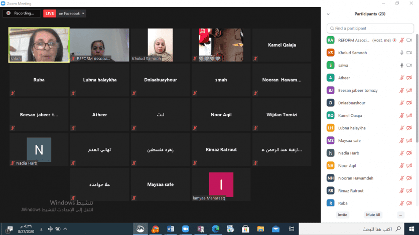 نفذت المؤسسة الفلسطينية للتمكين والتنمية المحلية -REFORM اليوم لقاء توعويا بعنوان " قانون الأحوال الشخصية وارتباطه بالحقوق الاقتصادية والاجتماعية للمرأة،" وذلك عبر تقنية الرابط الالكتروني zoom بحضور ومشاركة مستفيدي مشروع دور المرأة في تعزيز السلم الاهلي في محافظة الخليل وعدد من الفاعلين\ات مجتمعيا، والاستاذة المحامية خلود سموح من صندوق النفقة الفلسطيني والاستاذة سلوى بنورة من مركز المرأة للارشاد القانوني والاجتماعي كمتحدثات.