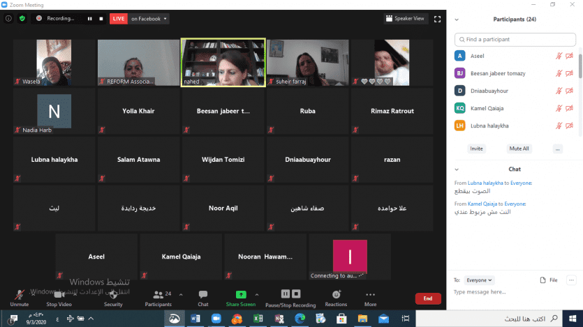 نفذت المؤسسة الفلسطينية للتمكين والتنمية المحلية –REFORM لقاء توعويا بعنوان " دور الاعلام في تعزيز شراكة النساء في الحياة العامة،" وذلك عبر تقنية الرابط الالكتروني ZOOM بحضور ومشاركة مستفيدي مشروع دور المرأة في تعزيز السلم الاهلي في محافظة الخليل وعدد من الفاعلين/ات مجتمعيا، كما شاركت السيدة سهير فراج مديرة جمعية تنمية واعلام المرأة تام والإعلامية السيدة ناهدة ابو طعيمه كمتحدثات.