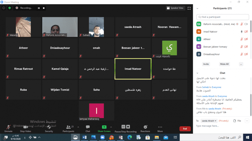 نفذت المؤسسة الفلسطينية للتمكين والتنمية المحلية —REFORM لقاء توعويا بعنوان " الحماية الاجتماعية للنساء سبيل الوصول للسلم الأهلي،" وذلك عبر تقنية الرابط الالكتروني ZOOM بحضور ومشاركة مستفيدي مشروع دور المرأة في تعزيز السلم الاهلي في محافظة الخليل وعدد من الفاعلين\ات مجتمعيا، والسيدة سائدة الاطرش مديرة مركز حماية وتمكين المرأة والأسرة (محور)، والعميد عماد ناطور من وحدة حماية الاسرة في شرطة كمتحدثين .بدء اللقاء بتعريف هدف الورشة، في اطار مناقشة أهمية الحماية الاجتماعية للنساء في تعزيز السلم الأهلي، ودور المؤسسات الرسمية والأهلية في ذلك ورفع وعي النساء حول اليات الحماية الاجتماعية.