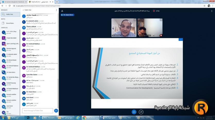 وتطرق أ. د. محمد شاهين أستاذ الإرشاد النفسي ومساعد رئيس الجامعة لشؤون الطلبة، إلى الضغوط النفسية التي يواجهها الصحفيون الفلسطينيون وطرق الوقائية منها في ظل جائحة كورونا.