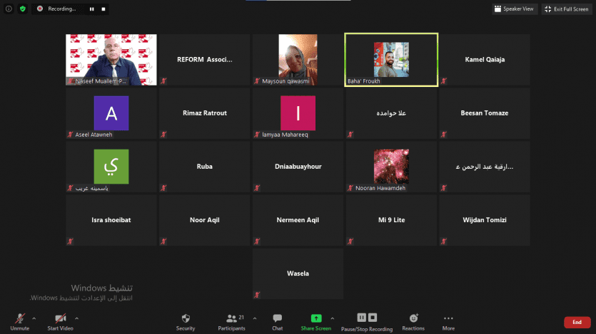 نفذت المؤسسة الفلسطينية للتمكين والتنمية المحلية -REFORM أمس لقاء حواريا بعنوان " مشاركة المرأة الفلسطينية في الترشح للانتخابات العامة بين محددات القانون والمجتمع " وذلك عبر تقنية الرابط الالكتروني zoom، بحضور ومشاركة مستفيدي مشروع دور المراة في تعزيز السلم الاهلي في محافظة الخليل وعدد من الفاعلين\ات مجتمعيا، حيث تحدث في اللقاء الناشطة النسوية السيدة ميسون القواسمة والسيد ناصيف معلم المدير العام لمركز السلام والديمقراطية. والسيد بهاء الفروخ ميسرا للقاء