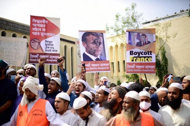 وردد المتظاهرون في شوارع داكا، عاصمة بنغلادش ذات الأغلبية المسلمة، الهتافات المطالبة بمقاطعة المنتجات الفرنسية ورفعوا لافتات تصف ماكرون بأنه "أكبر إرهابي في العالم".