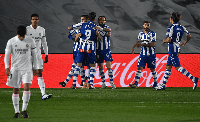 وبالعودة إلى مجريات اللقاء، فقد خطف الضيوف هدف السبق مبكراً في الدقيقة الرابعة بعد أن لمس لاعب ​الميرينغي​ الدولي ​ناتشو​ الكرة بيده داخل المنطق، لينجح ​لوكاس بيريز​ بركن الكرة في شباك الحارس ​كورتوا​، بعد ذلك انتفض أصحاب الأرض وحاولوا مراراً خطف التعادل لكنهم أخفقوا، بينما استفاد ألافيس من الهجمات المرتدة الخطيرة التي انهك بها دفاعات الملكي، وفي منتصف الشوط أصيب العائد إيدينت ​هازارد​ لتتفاقم مصائب المدرب الفرنسي ​زيدان​ الذي سرعان ما استعجل بتبديله وأدخل البرازيلي رودريغو لكن النتيجة لم تتغير وانتهى هذا الشوط بنتيجة 1 - 0.
