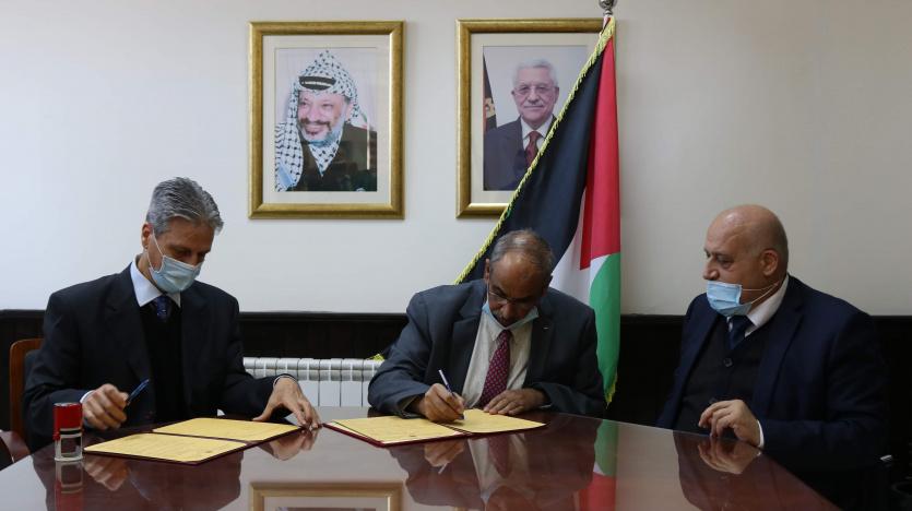 وقع وزير الاشغال العامة والإسكان د. محمد زيارة، اليوم، مع المجموعة العالمية للهندسة والاستشارات، اتفاقية عقد تقديم خدمات هندسية (دراسات وتصاميم وإعداد وثائق عطاء لمشروع الطريق البديل لشارع وادي النار)، بحضور وزير العمل نصري أبو جيش.