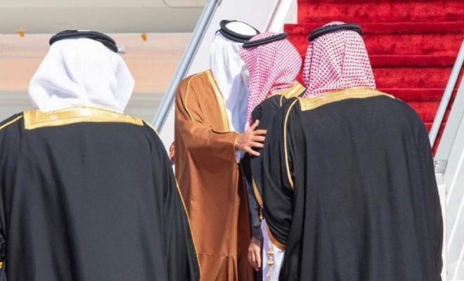 وقالت قناة "الإخبارية" السعودية، إن "ولي العهد السعودي، الأمير محمد بن سلمان، استقبل أمير قطر بعناق فور نزوله سلم الطائرة".