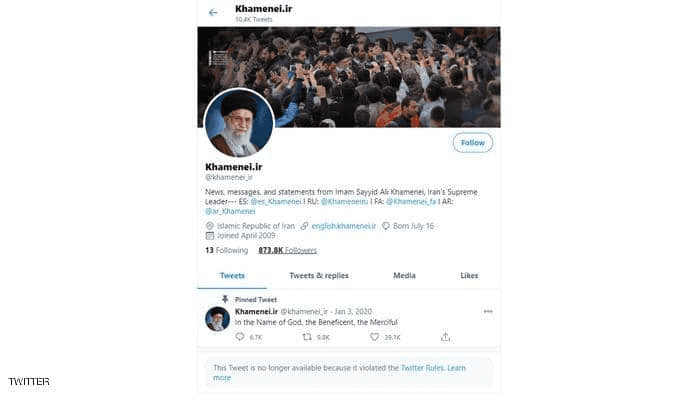 فبعد أن حارب تغريدات الرئيس الأميركي دونالد ترامبوبعض السياسيين الأميركيين، حجب موقع تويتر تغريدة نشرتها حسابات تابعة للموقع الإلكتروني الرسمي للمرشد الإيراني علي خامنئي.