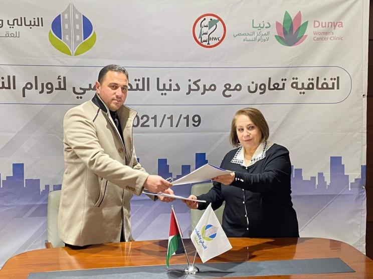 وقعت مؤسسة لجان العمل مع مجموعة النبالي والفارس القابضة إتفاقية تعاون لصالح دنيا المركز التخصصي لأورام النساء التابع للجان في مقر مجموعة النبالي والفارس في مدينة رام الله وذلك في ختام لقاء جمع الطرفين بحضور المديرة العامة للعمل الصحي شذى عودة والدكتورة نفوز مسلماني مديرة مركز دنيا والإعلامي خالد الفقيه مسؤول الاعلام في المؤسسة فيما مثل مجموعة النبالي والفارس المدير العام المهندس عماد الخطيب وبحضور رامي علوي مدير العلاقات العامة والتسويق في المجموعه.